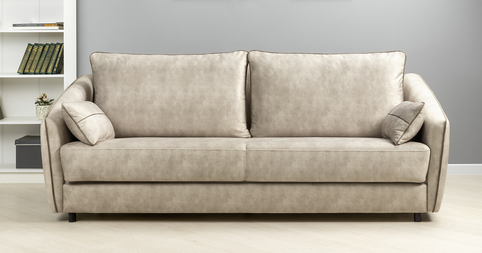 Подлокотники с выраженным контрастным кантом по внешнему контуру изделия. Декоративные подушки оформлены декоративной отстрочкой «зигзаг».