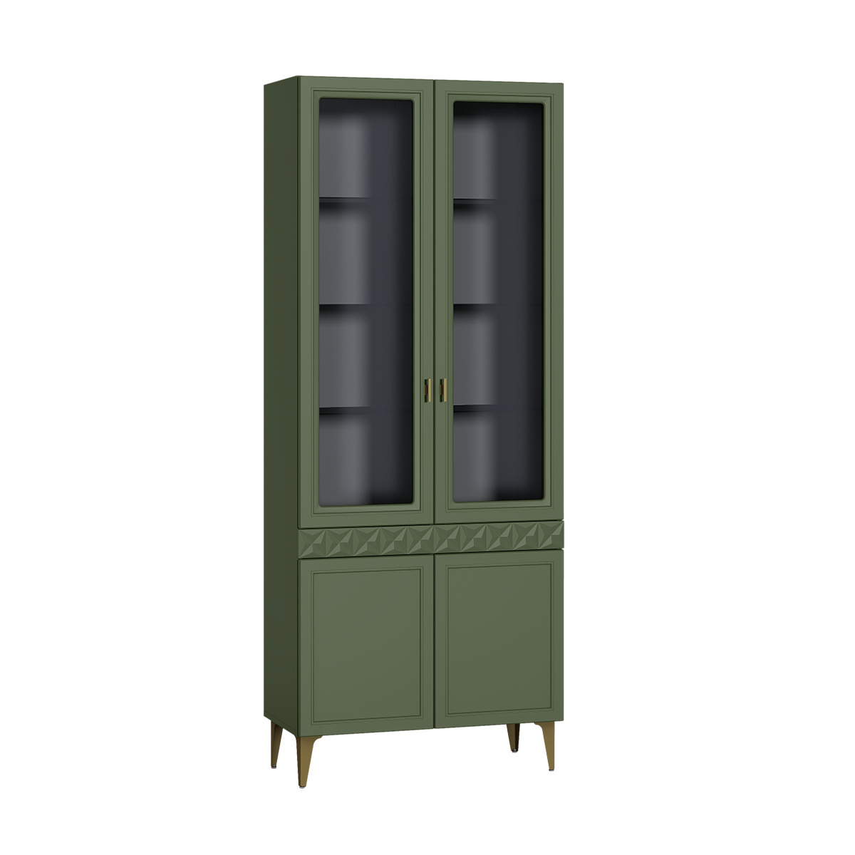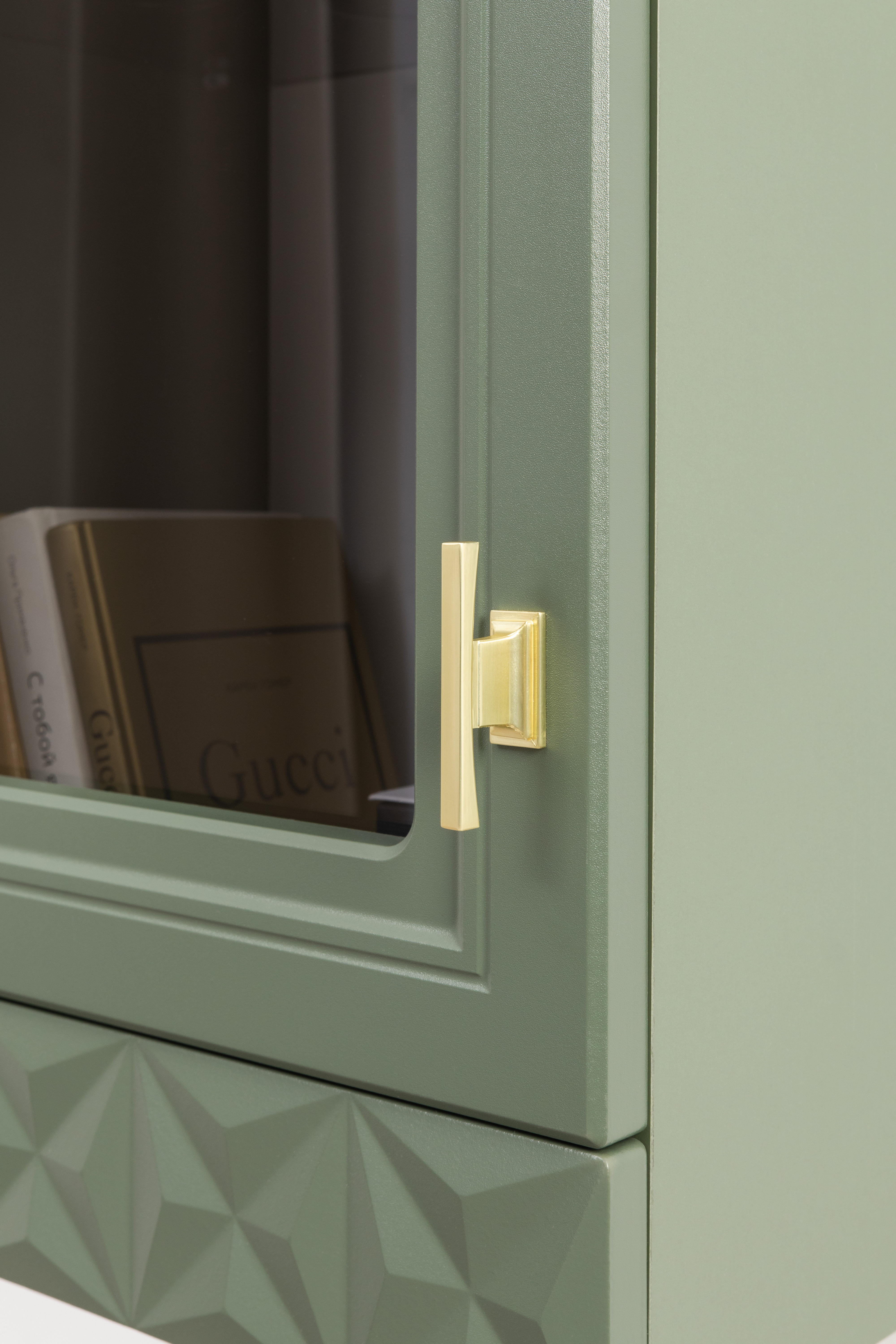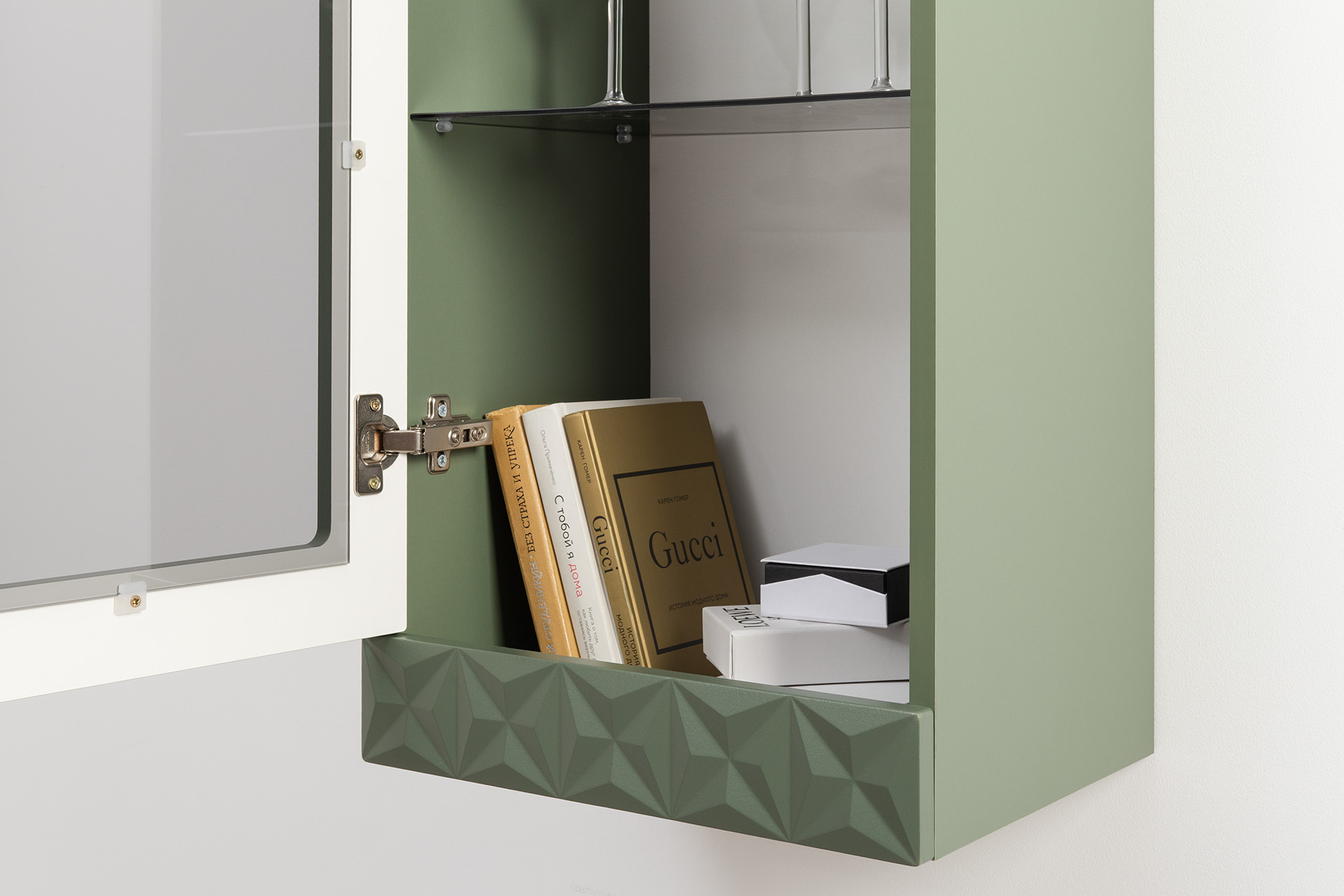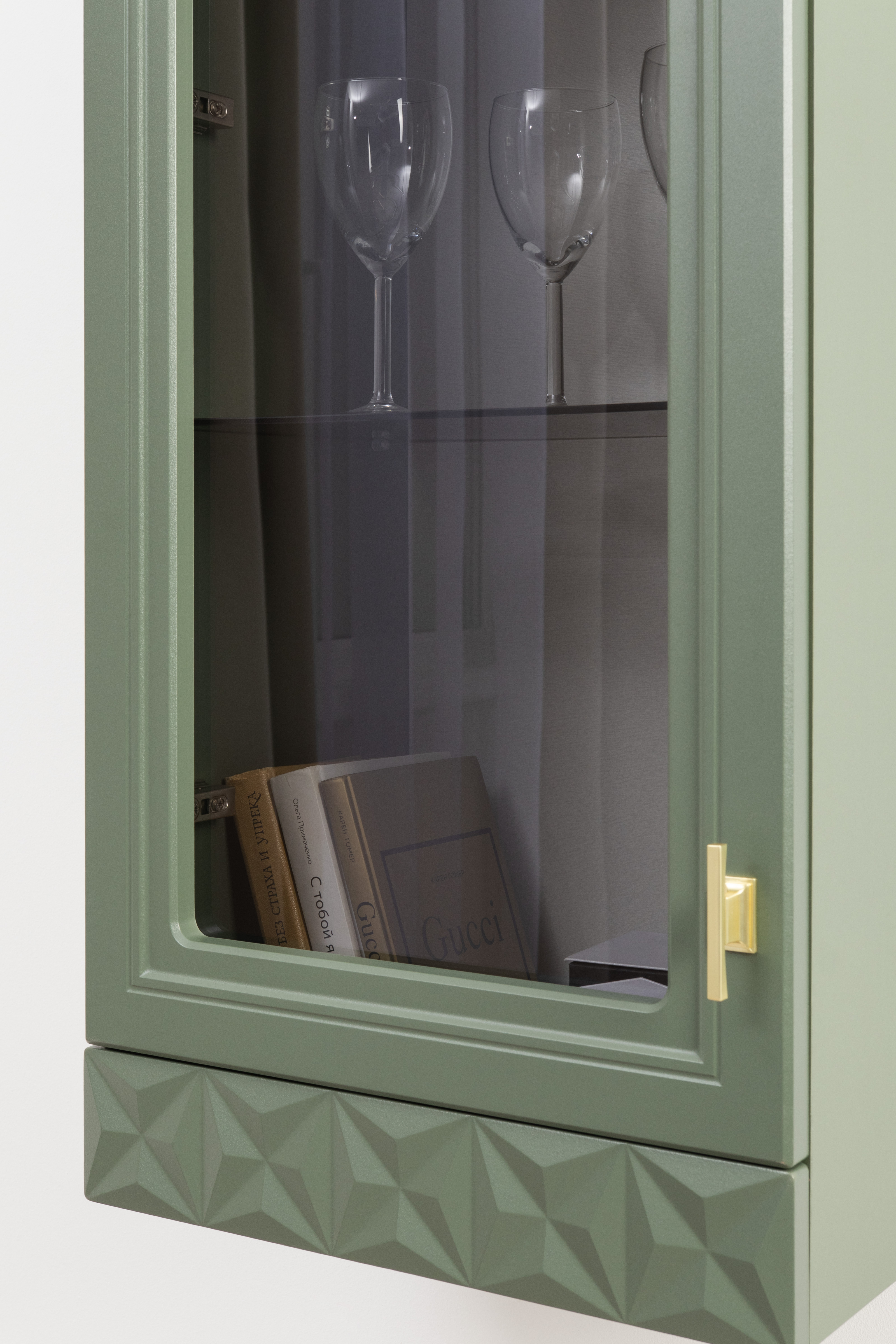 Шкаф-витрина Марион 16.397.02 дымчатый зеленый K521, олива шагрень AG 1050 ПВХ