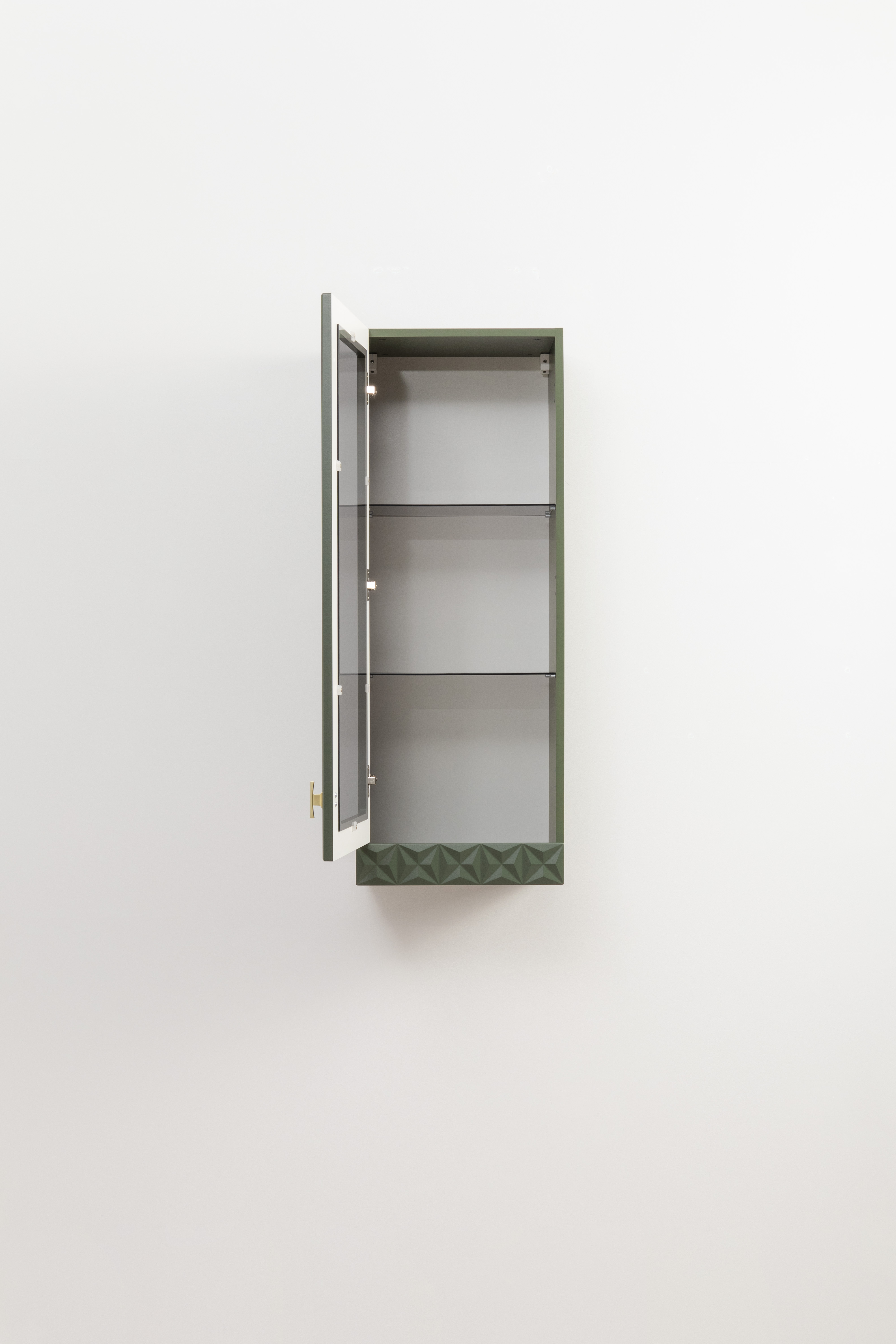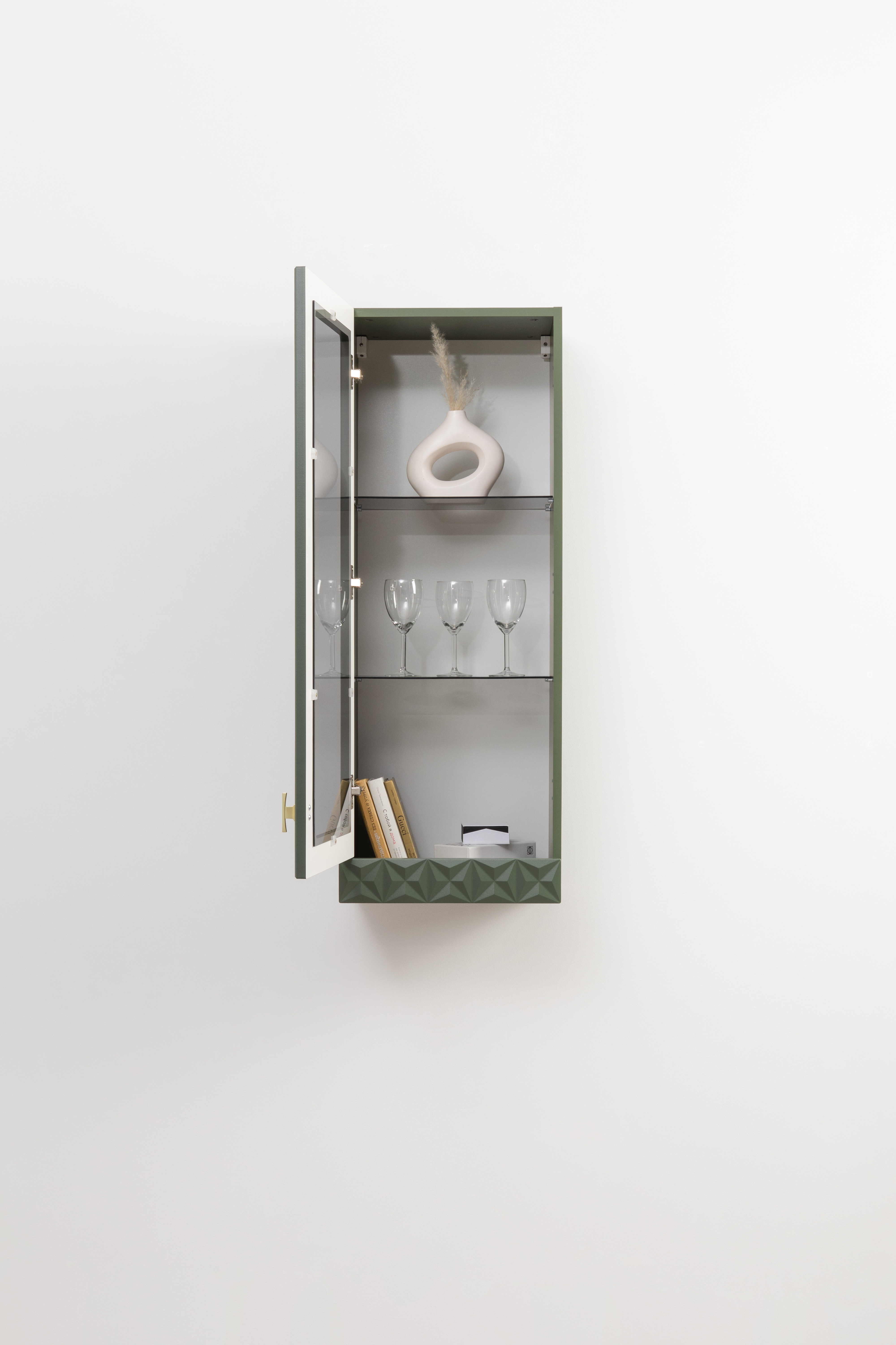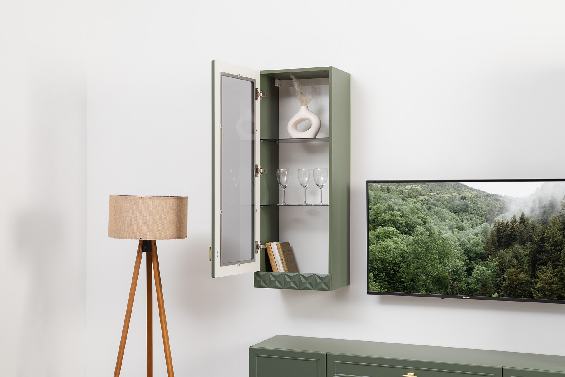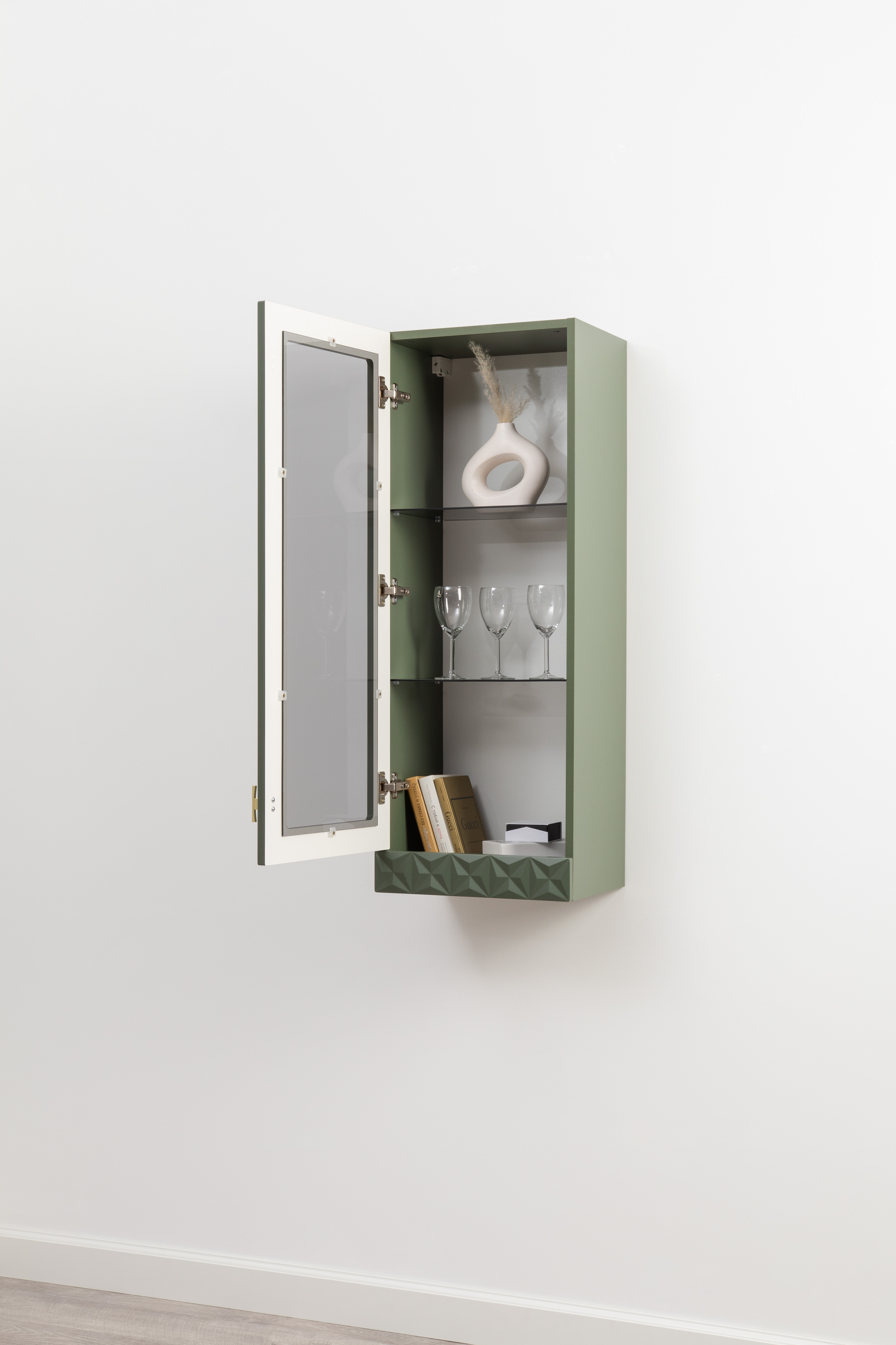 Шкаф-витрина Марион 16.397.01 дымчатый зеленый K521, олива шагрень AG 1050 ПВХ (собирается на любую сторону)
