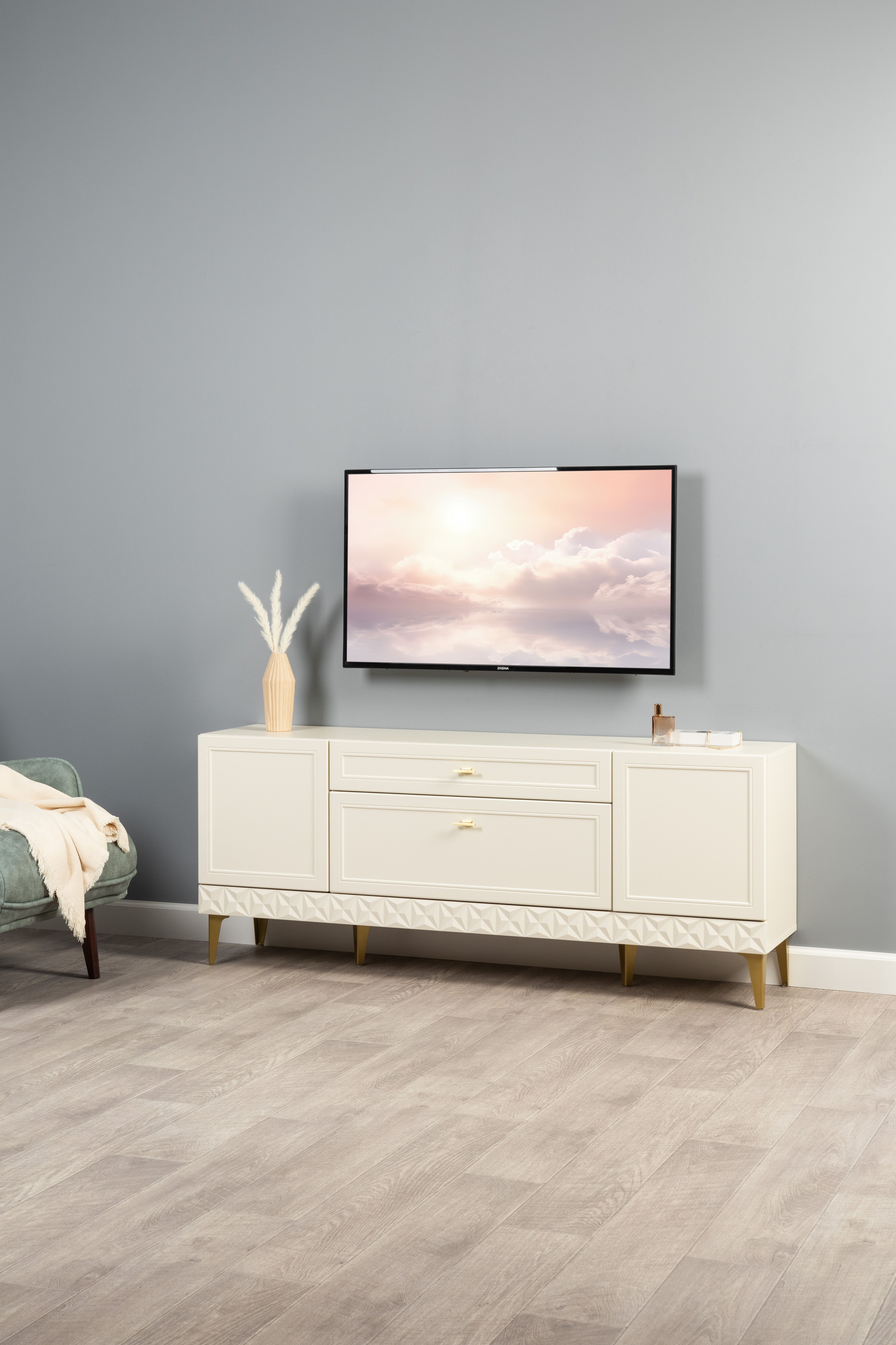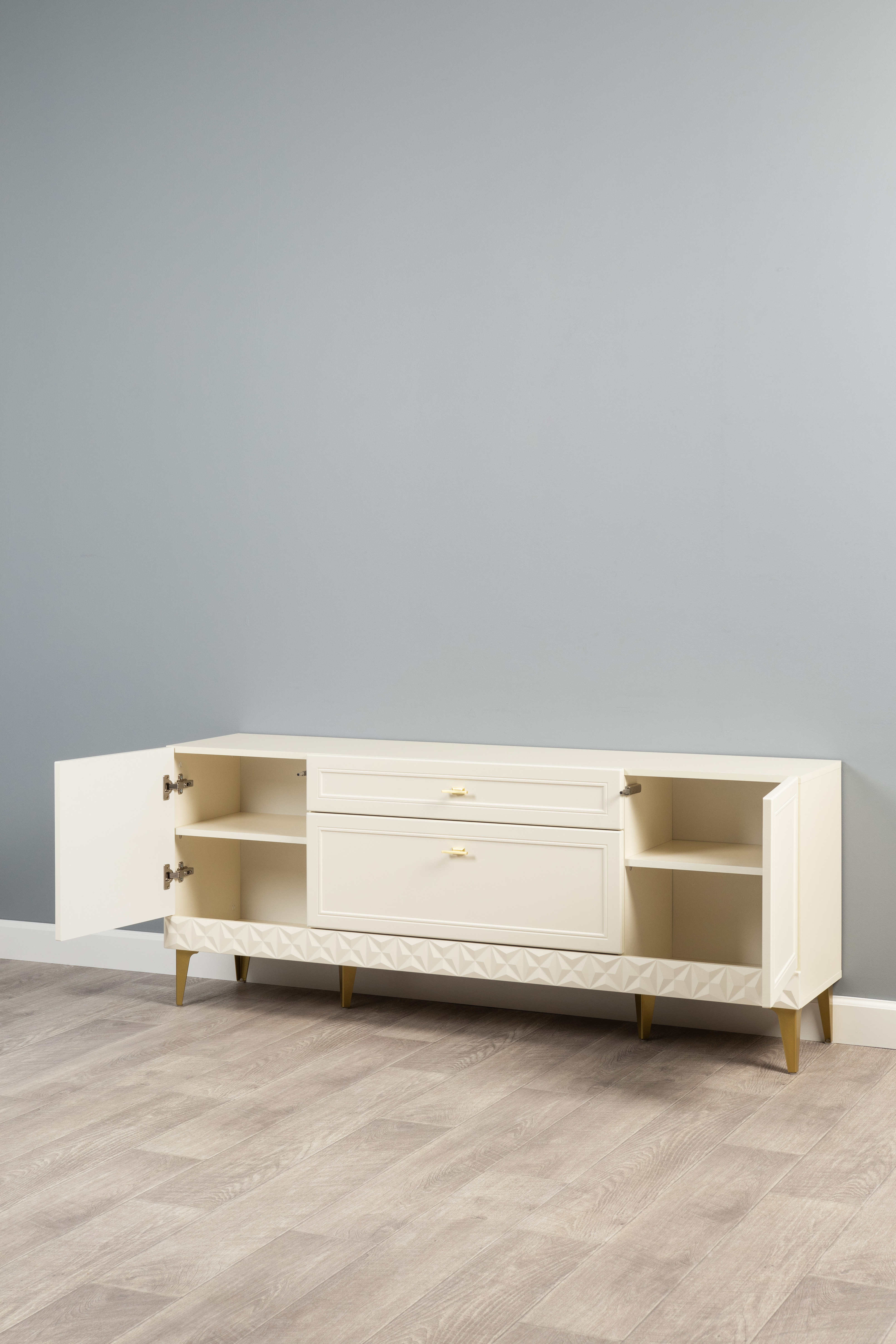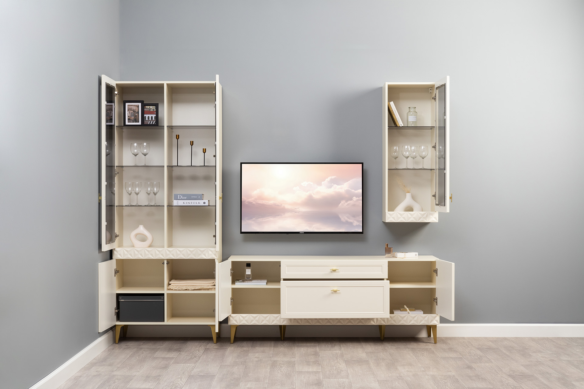 Гостиная Марион композиция 3 слоновая кость С341 PE, слоновая кость 6898 ПВХ, белый PE шагрень (собирается на любую сторону)