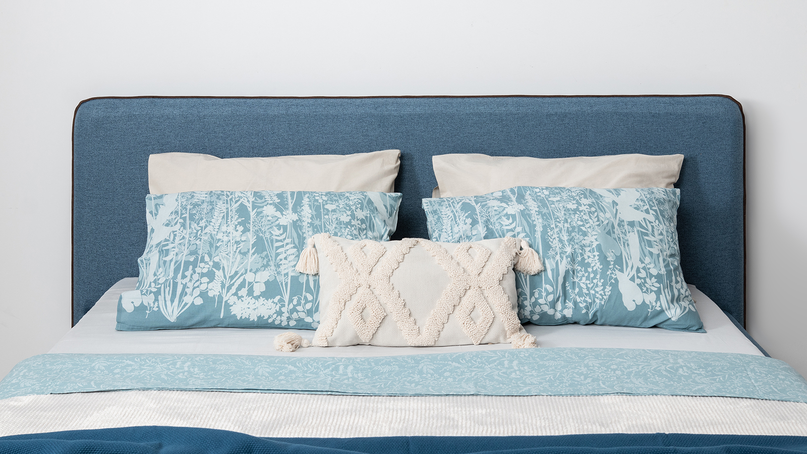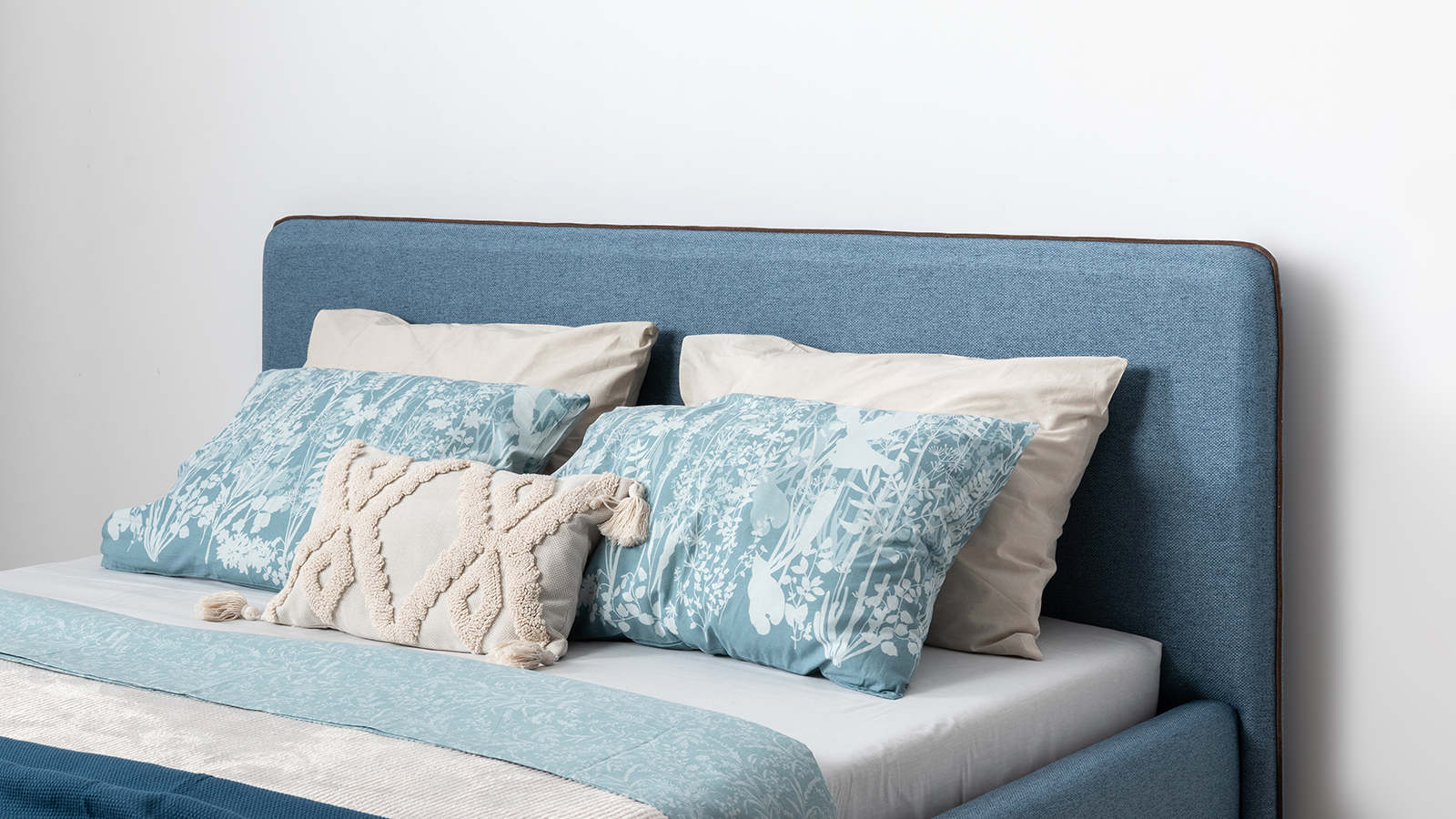 Кровать Миа 140 рогожка светло-синий, кант желтовато-коричневый с ортопедическим основанием и подъемным механизмом