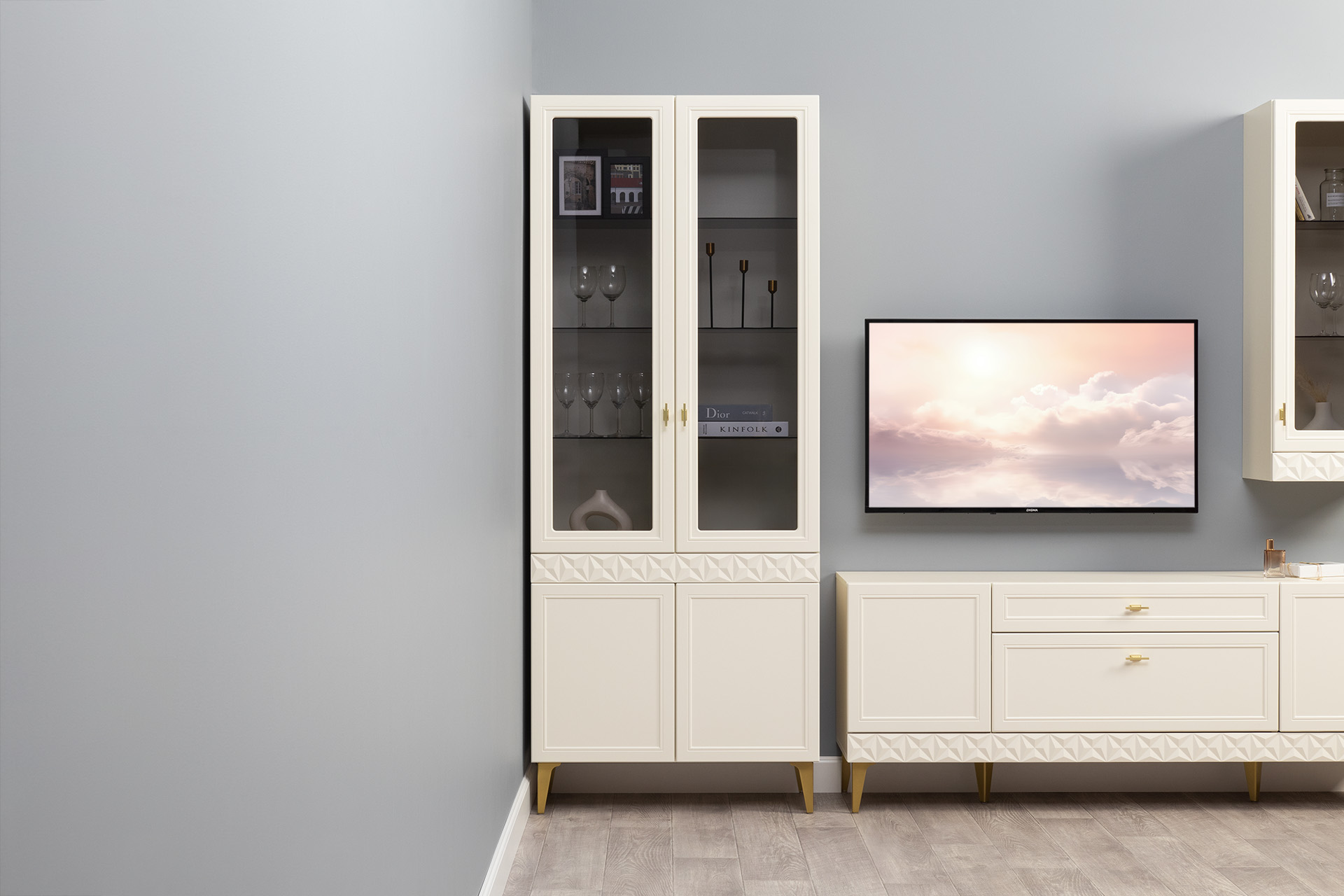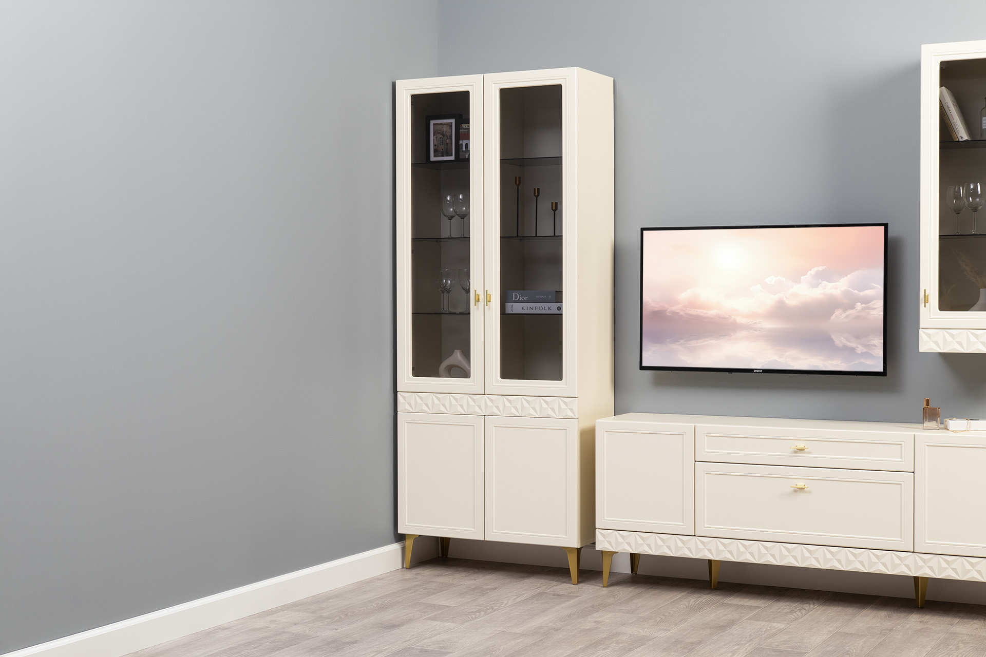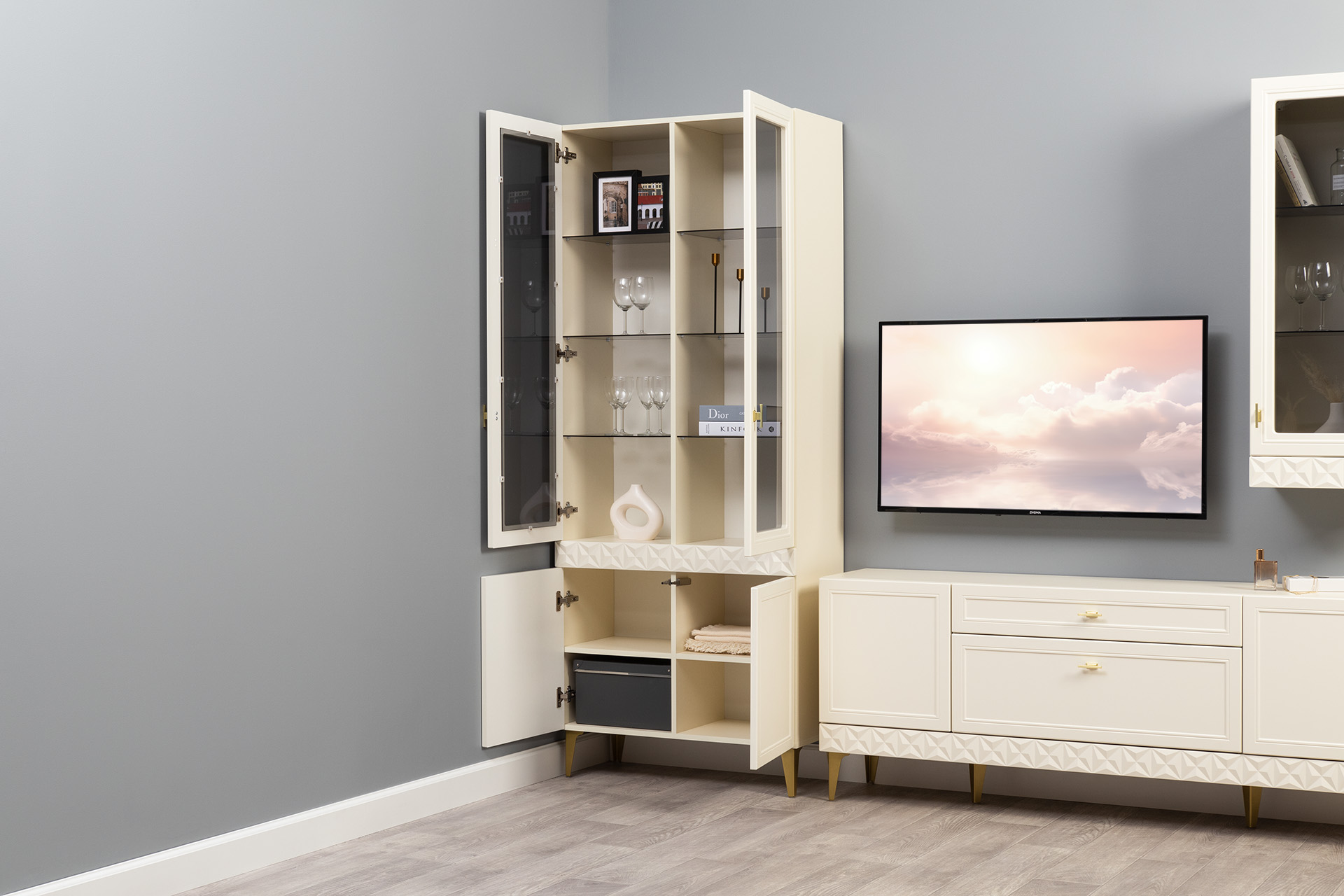 Шкаф-витрина Марион 16.397.01 слоновая кость С341 PE, слоновая кость 6898 ПВХ (собирается на любую сторону)