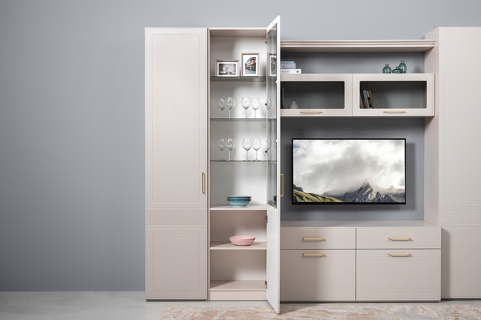 Тумба под ТВ Ричфорд 16.61 кашемир 5981 BS, моно керамика D166-2 ПВХ, белый PE шагрень